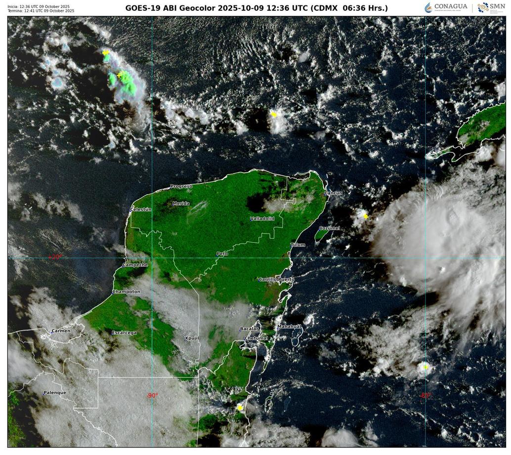 Este jueves 9 de octubre de 2025, Quintana Roo enfrenta un día de clima complejo, marcado por chubascos fuertes, humedad elevada y temperaturas que rozan los 35 °C. La interacción de un canal de baja presión con humedad proveniente del mar Caribe está generando lluvias intensas en la Península de Yucatán, incluyendo todo el estado.