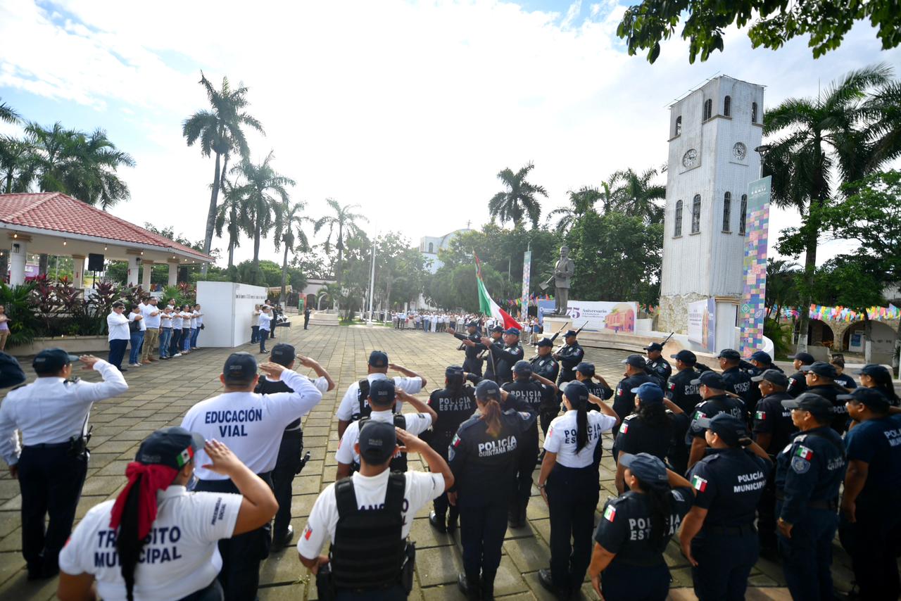 El acto fue encabezado por la secretaria de gobierno municipal, Alicia Tapia Montejo, en representación de la presidenta municipal Mary Hernández, junto a funcionarios y trabajadores del ayuntamiento. Durante la ceremonia, se rindieron honores a la bandera nacional y se entonaron los himnos de Quintana Roo y de México.