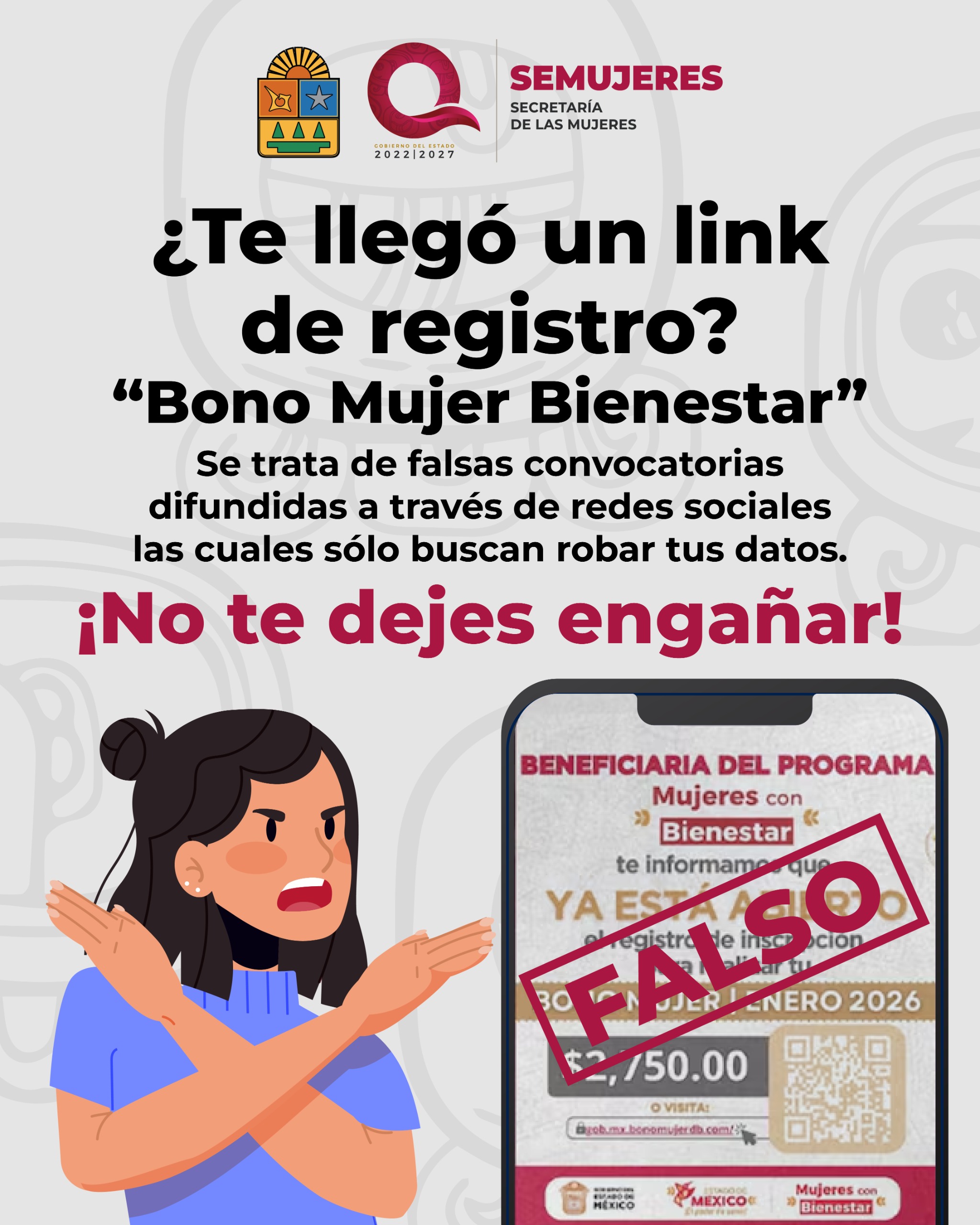 SEMUJERES reiteró que el Gobierno de México, encabezado por la presidenta Claudia Sheinbaum Pardo, no opera ningún programa llamado “Bono Mujer Bienestar”, ni solicita registros mediante enlaces externos enviados por teléfono móvil. Además, recordó que los programas sociales no se anuncian ni se gestionan por WhatsApp, por lo que cualquier mensaje que solicite datos personales debe considerarse sospechoso.