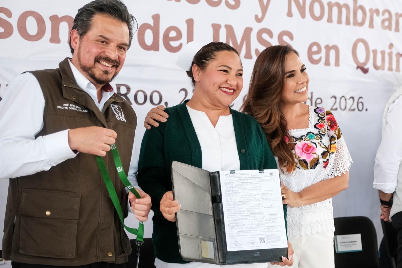 Cancún.– En un acto considerado clave para el fortalecimiento del sistema de salud en Quintana Roo, la gobernadora Mara Lezama Espinosa y el director general del IMSS, Zoé Robledo, encabezaron la entrega de 71 bases laborales a trabajadoras y trabajadores del Instituto Mexicano del Seguro Social. Del total, 41 corresponden a mujeres que, pese a años de servicio, no contaban con certeza laboral.
