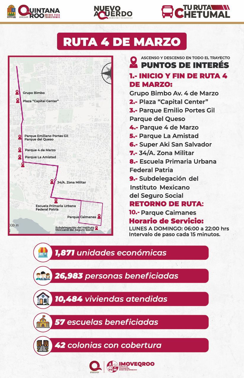 La ruta piloto “4 de Marzo” operará diariamente de 06:00 a 22:00 horas y recorrerá 42 colonias, beneficiando directamente a más de 26 mil personas, 10 mil viviendas, 57 centros educativos y mil 800 unidades económicas. Su trayecto iniciará y concluirá en la intersección de la avenida Maxuxac con 4 de Marzo, pasando por puntos estratégicos como Grupo Bimbo, Capital Center, Parque del Queso, Unidad La Charca, la Zona Militar y la escuela Patria.