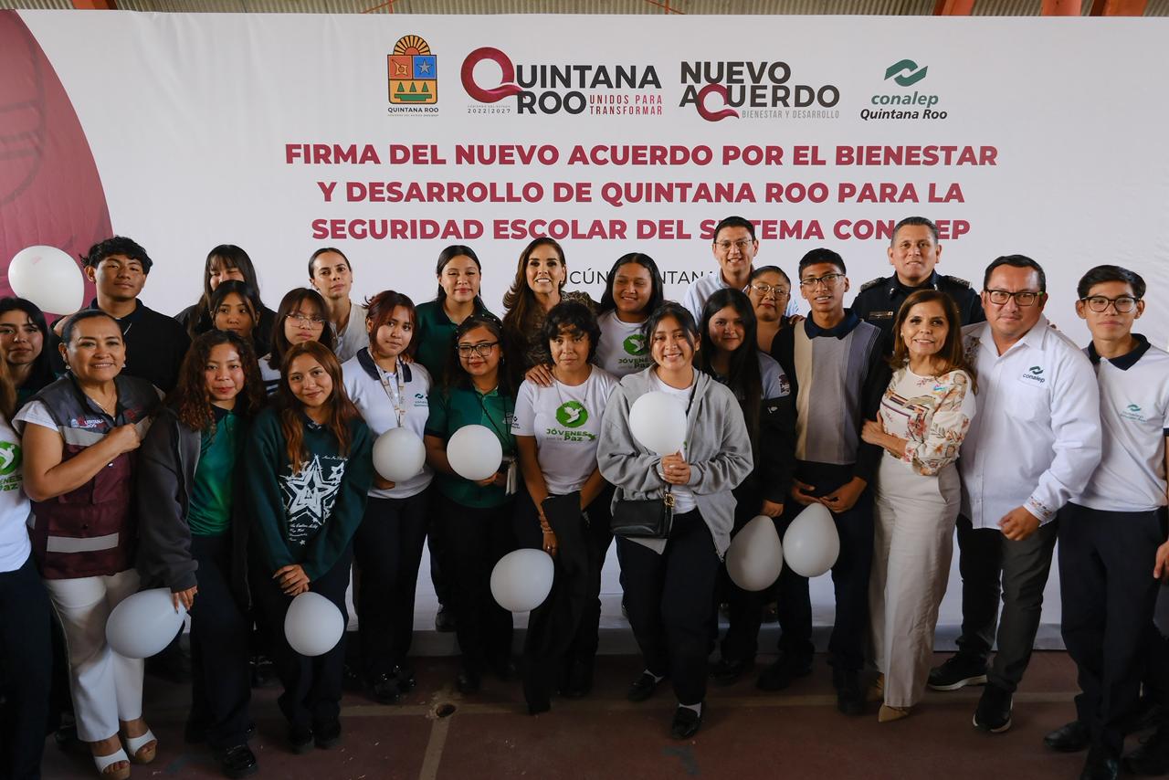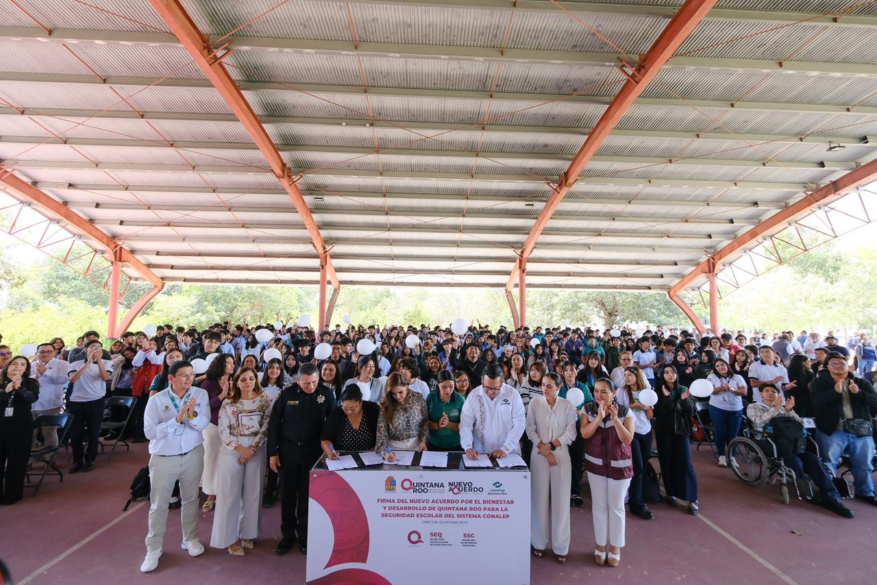 La gobernadora Mara Lezama Espinosa encabezó en Cancún la firma del Nuevo Acuerdo del Bienestar, un compromiso institucional que marca un antes y un después en la protección de más de 10 mil estudiantes del sistema CONALEP en Quintana Roo. El convenio, considerado histórico por su alcance y modelo de operación, conectará los ocho planteles y una extensión académica directamente con el Complejo de Seguridad C5, garantizando vigilancia permanente, reacción inmediata y entornos escolares más seguros.