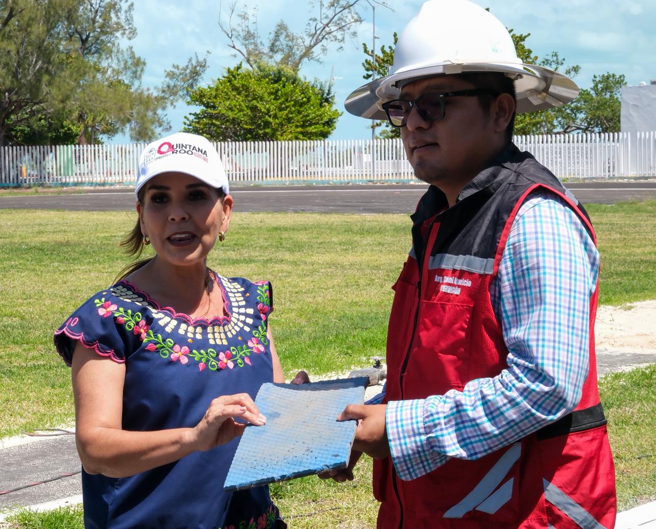 Durante un recorrido por la obra, la Gobernadora confirmó que el proyecto avanza conforme a los estándares internacionales. Actualmente, la superficie se encuentra en el periodo técnico de oxidación de la mezcla asfáltica, un proceso de 30 días indispensable para garantizar la durabilidad y adherencia del recubrimiento sintético. Este recubrimiento será de material Mondo, el mismo utilizado en Juegos Olímpicos y reconocido mundialmente por su calidad y certificación.
