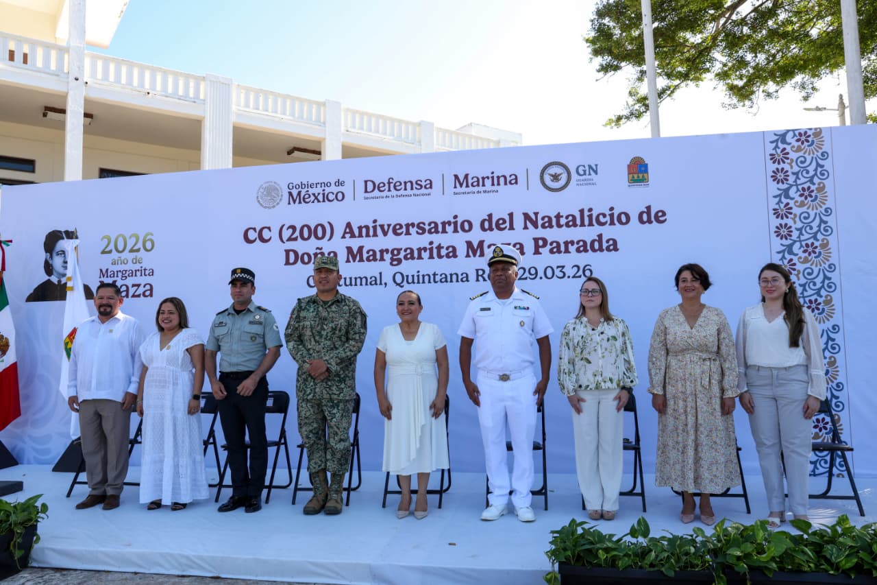 Chetumal conmemoró este 29 de marzo el bicentenario del natalicio de Margarita Maza de Juárez, una de las figuras femeninas más relevantes en la historia nacional por su papel en la defensa de la República y su influencia en la vida política y social del México del siglo XIX. El acto solemne reunió a autoridades de los tres órdenes de gobierno, así como a representantes de instituciones civiles y militares, quienes rindieron homenaje a su legado en la plaza cívica frente al Palacio de Gobierno.