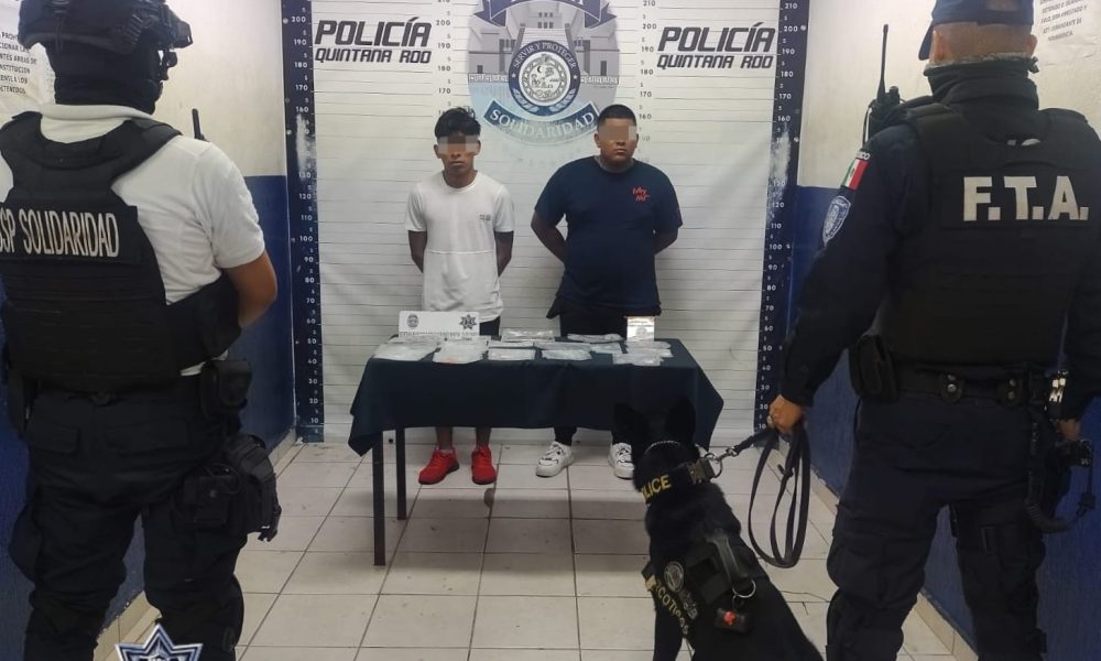 Solidaridad.- Durante el operativo de prevención y disuasión de delitos en la Quinta Avenida, elementos de la Policía Municipal de Solidaridad aseguraron a dos sujetos en...
