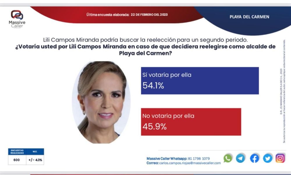 Playa del Carmen.- Según la última encuesta elaborada por Massive Caller para medir la intención del voto para la alcaldía de Playa del Carmen, el 54.1...