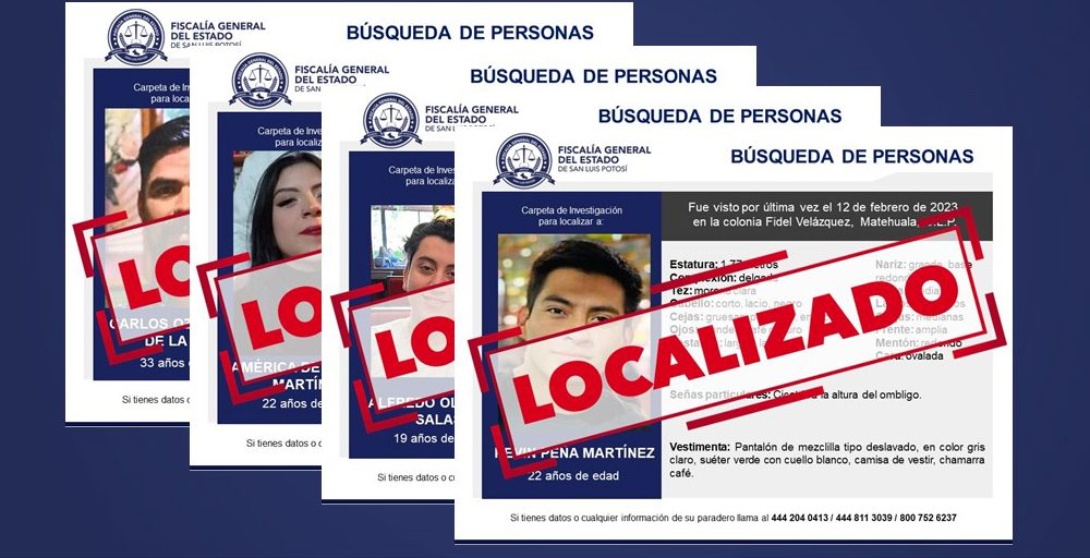 San Luis Potosí.- La Fiscalía General del Estado de San Luis Potosí (FGESLP), confirmó que ya fueron localizados los tres hombres y la mujer que fueron reportados como desaparecidos en Matehuala....