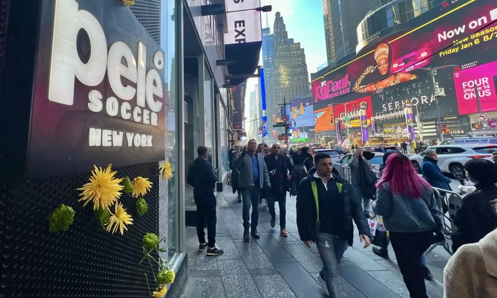 EU.- Flores amarillas y verdes colgaban de la fachada de la tienda Pelé Soccer de Nueva York, situada en la icónica plaza de Times Square, en...