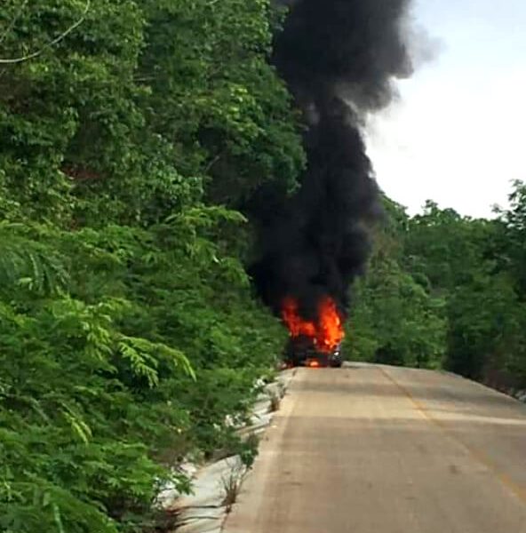 JOSÉ MARÍA MORELOS.- Un vehículo de transporte de pasajeros que circulaba por el tramo Benito Juárez-Kancabchen, con rumbo a la cabecera municipal se incendio sin motivo...