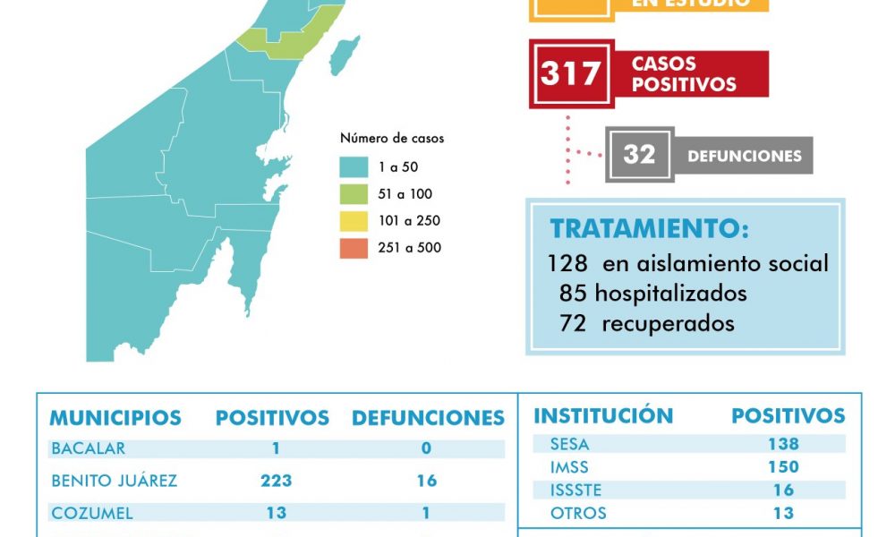 CHETUMAL.- La Secretaría de Salud, a cargo de Alejandra Aguirre informó que hasta este sábado Quintana Roo suma 317 casos positivos de Covid-19 e incrementan dos...
