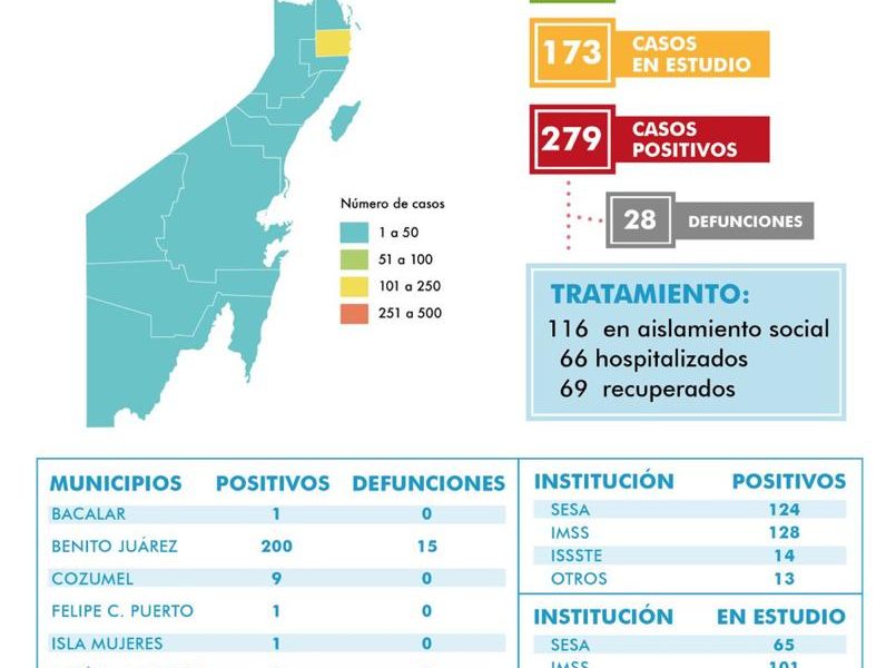 CHETUMAL.- La Secretaría de Salud informó que al día de hoy suman 279 casos positivos de coronavirus y 28 defunciones. De acuerdo al panorama general reportado...