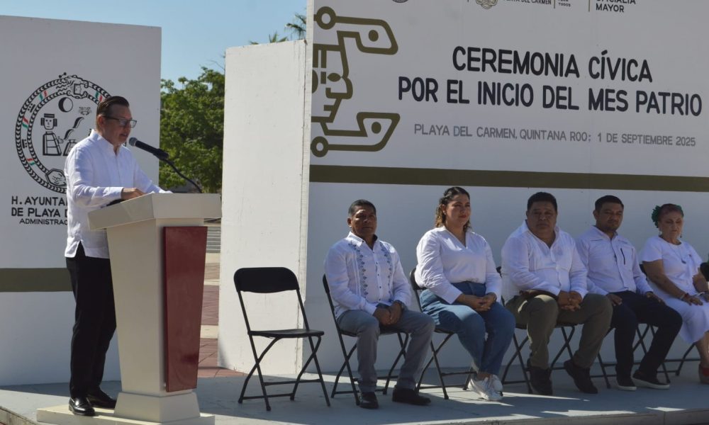Playa del Carmen, Quintana Roo, 1 de septiembre de 2025.— Con el izamiento de la bandera monumental en la Plaza 28 de Julio, autoridades municipales dieron...